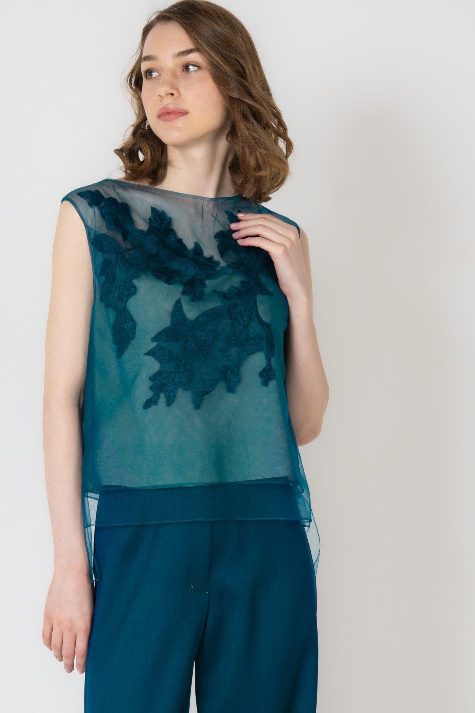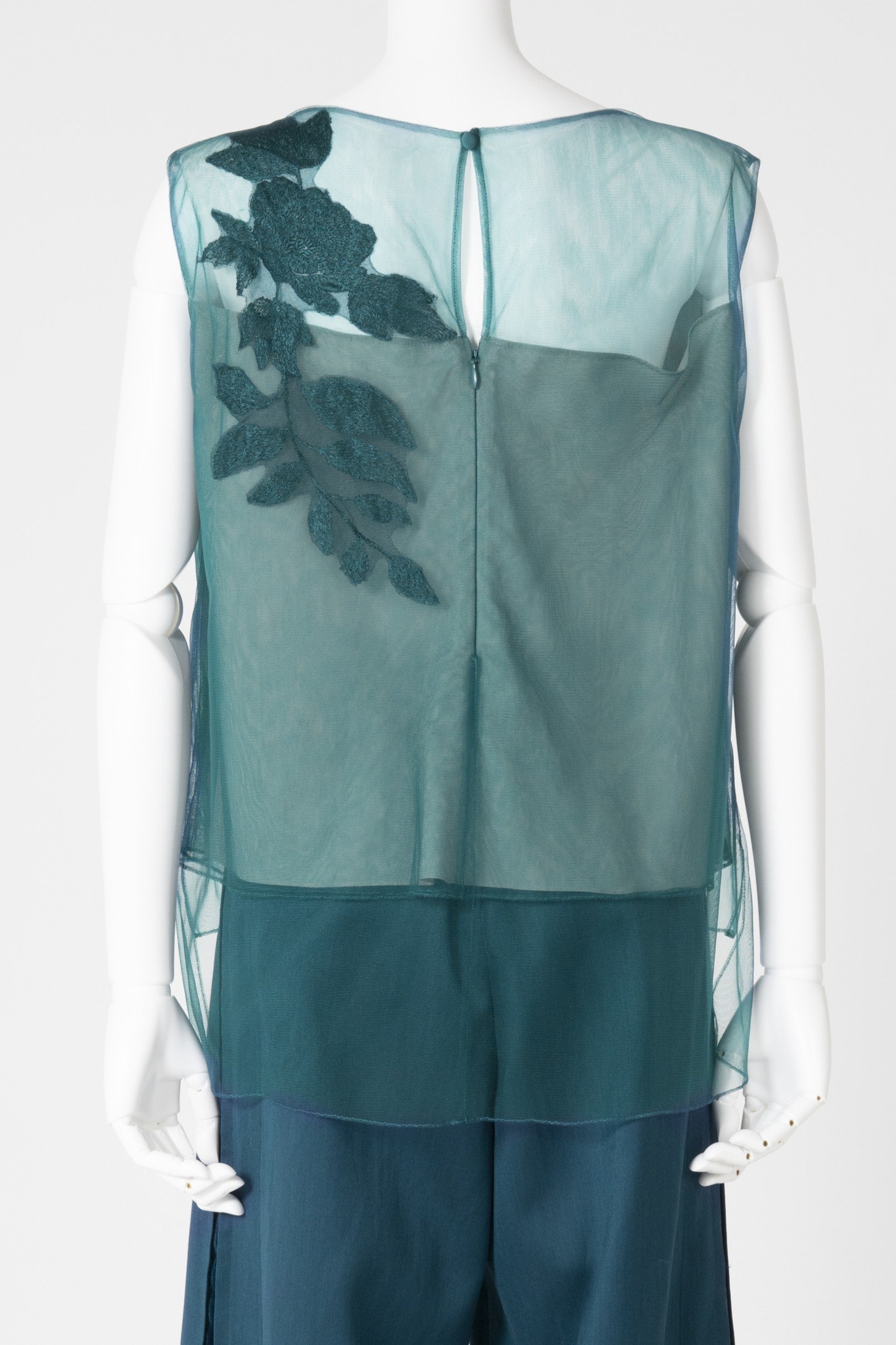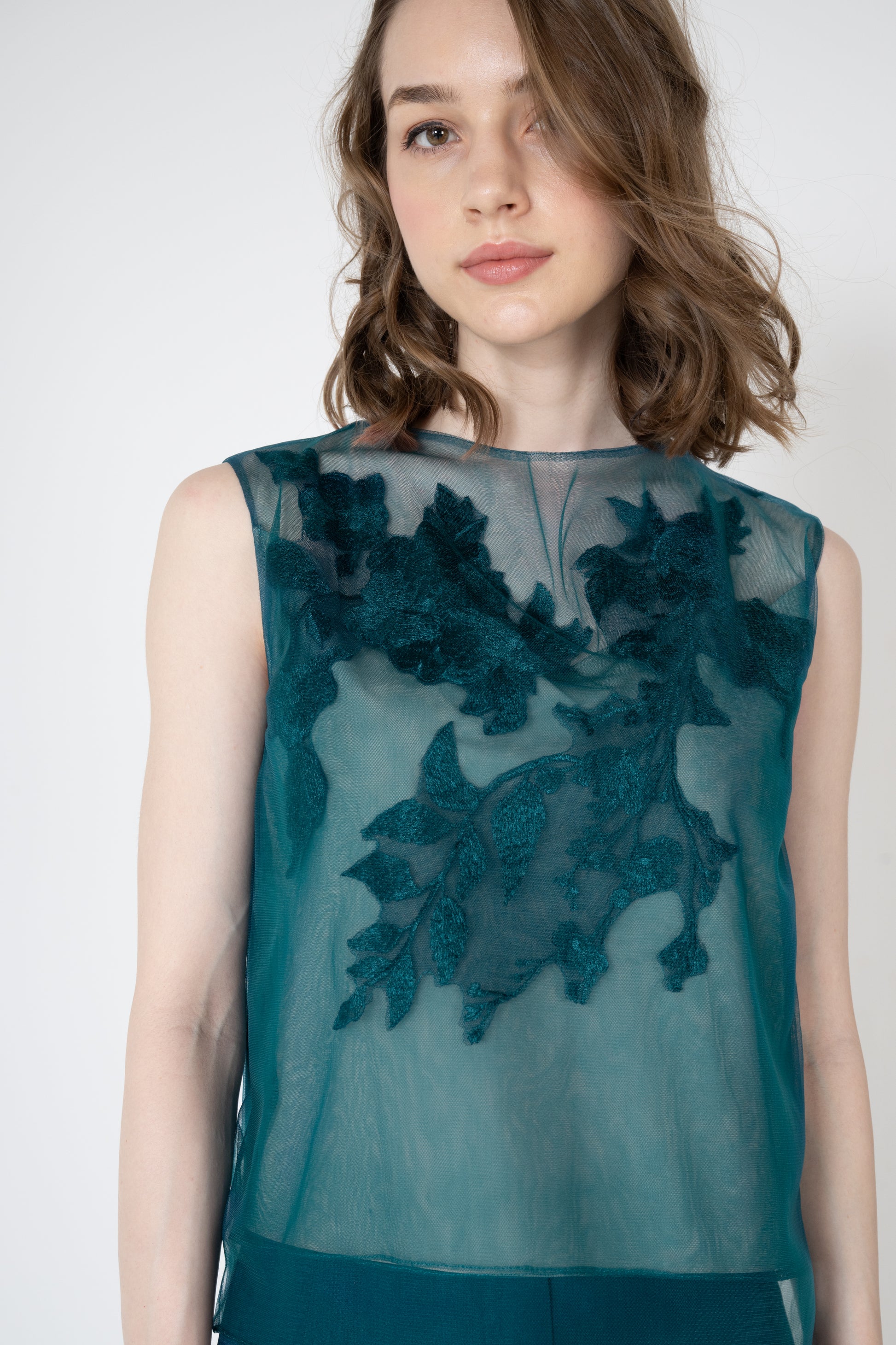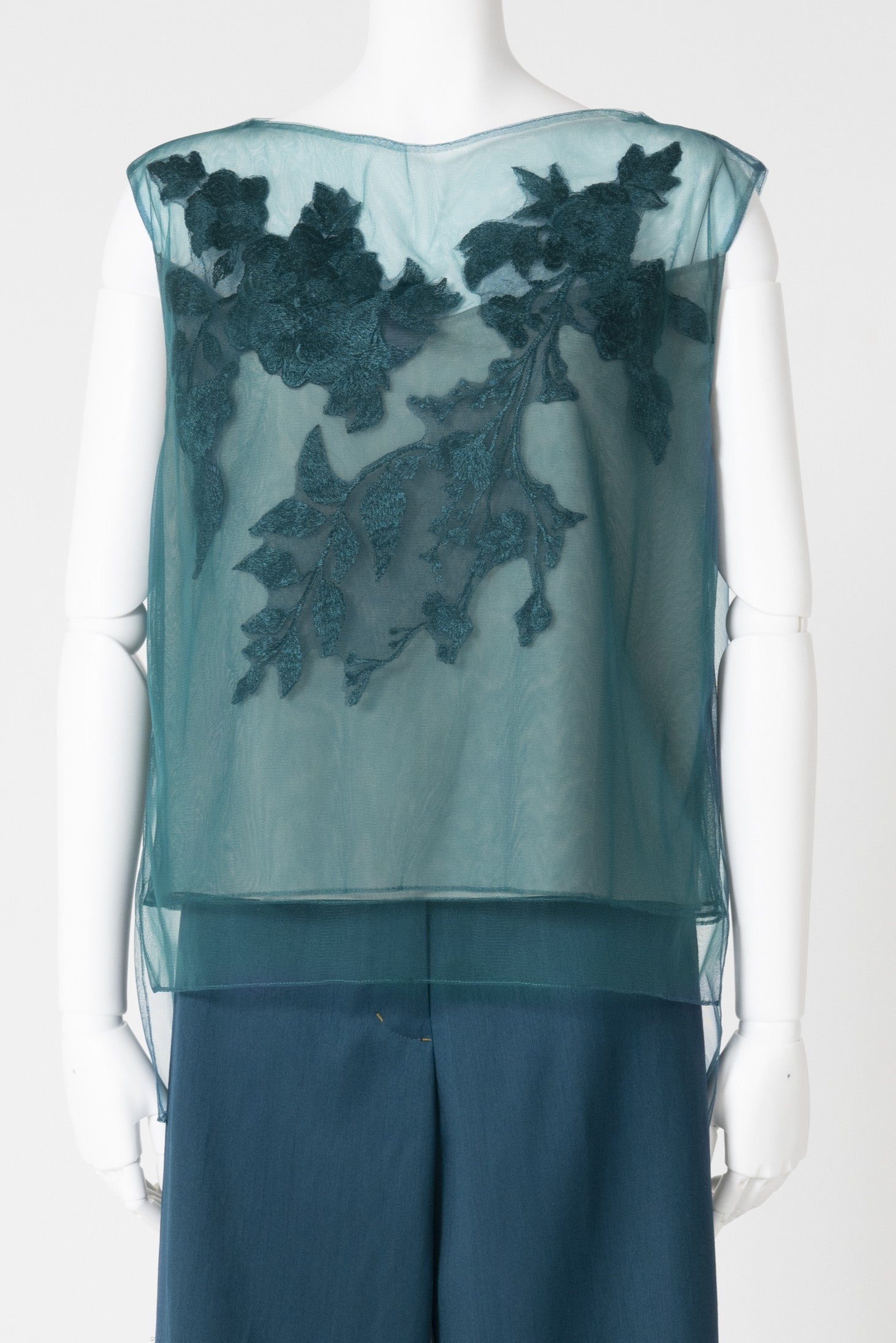 エンブロイダリーモチーフを胸元に大胆にあしらったシアー感があるノースリーブのブラウスです。