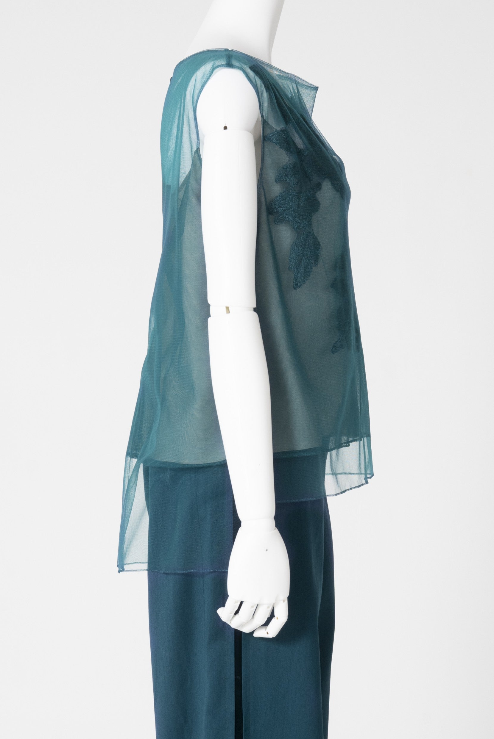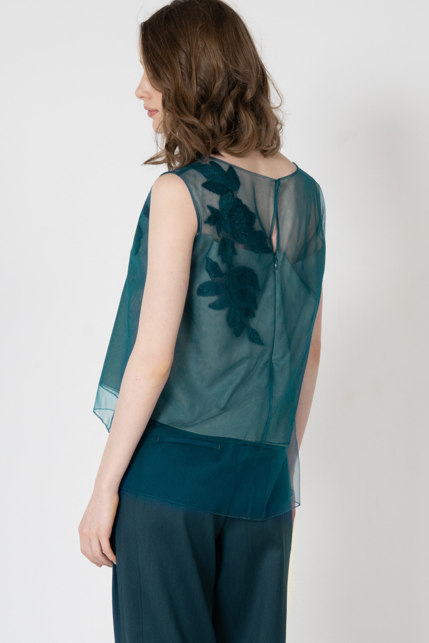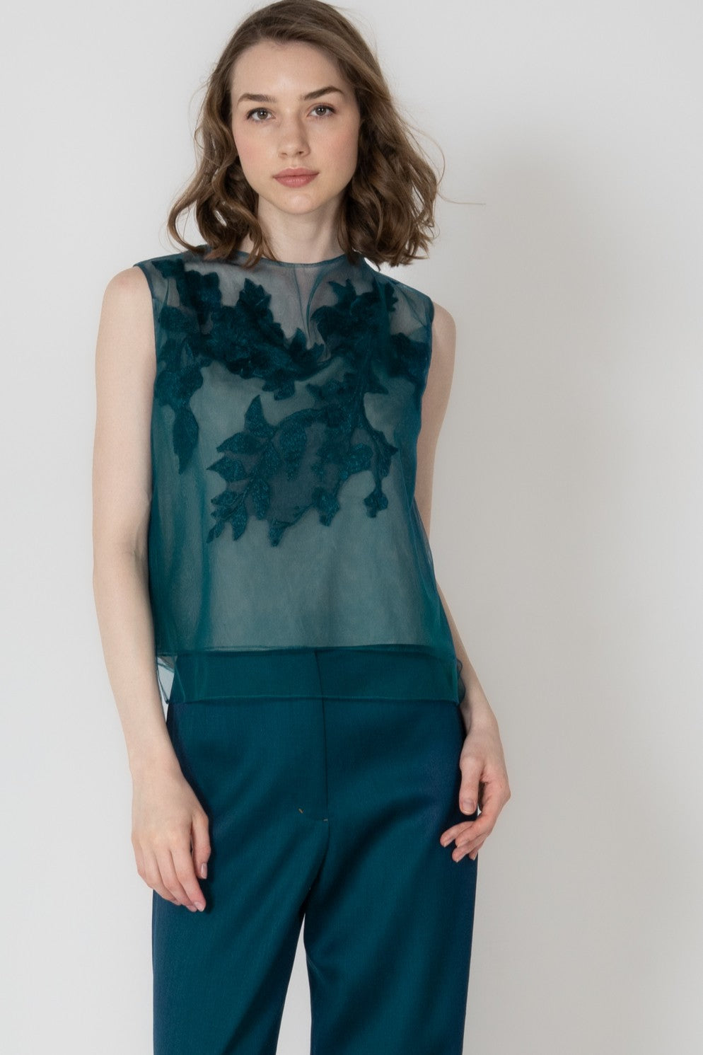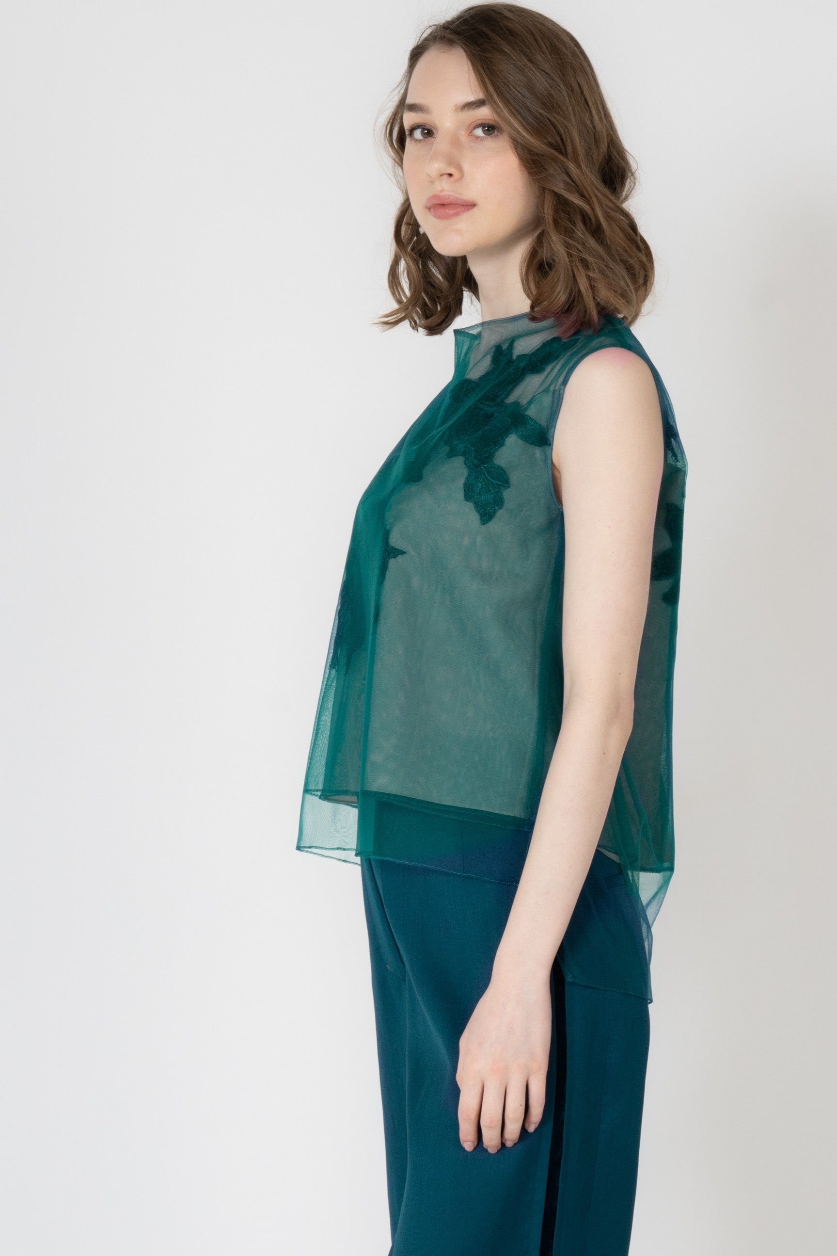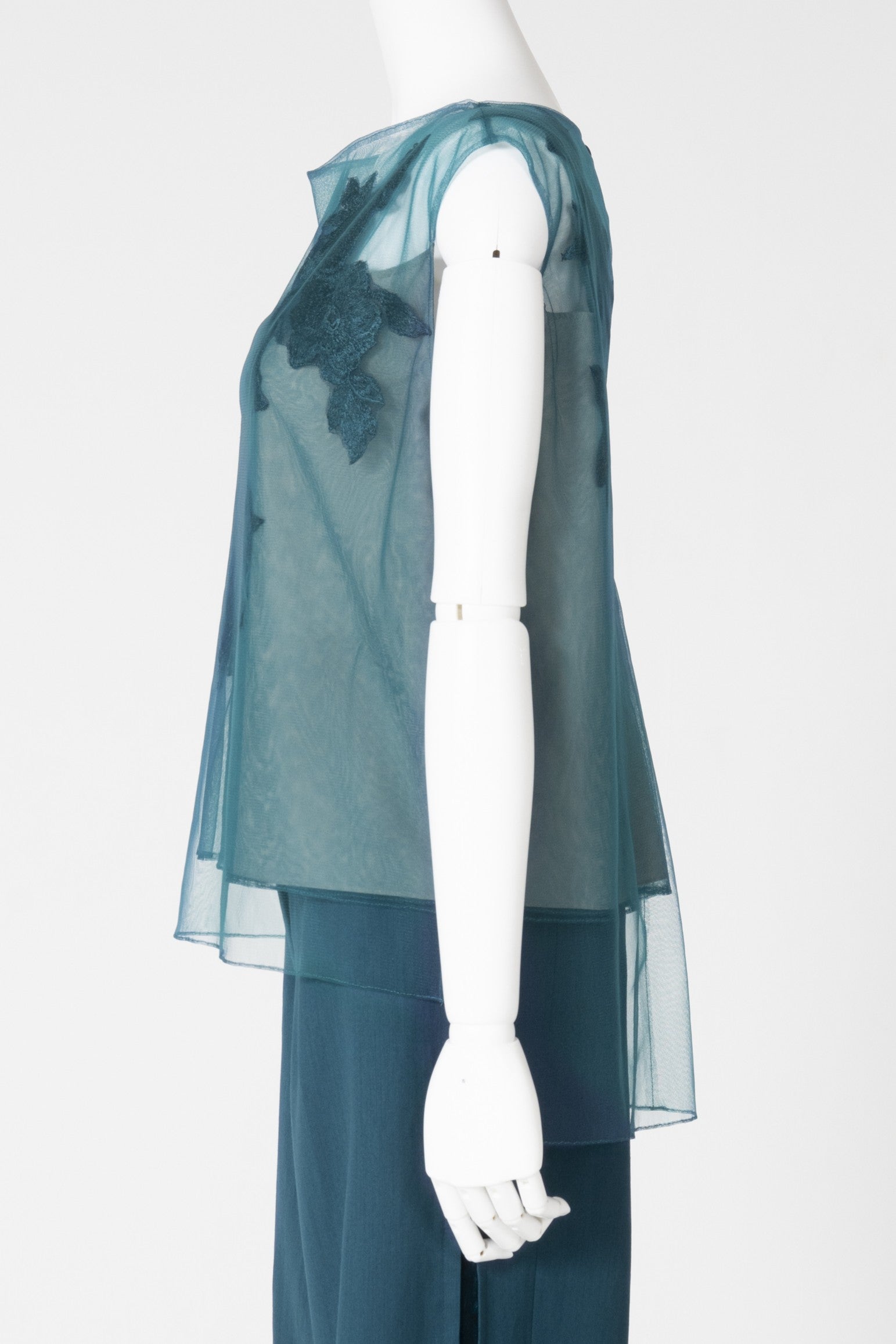 エンブロイダリーモチーフを胸元に大胆にあしらったシアー感があるノースリーブのブラウスです。