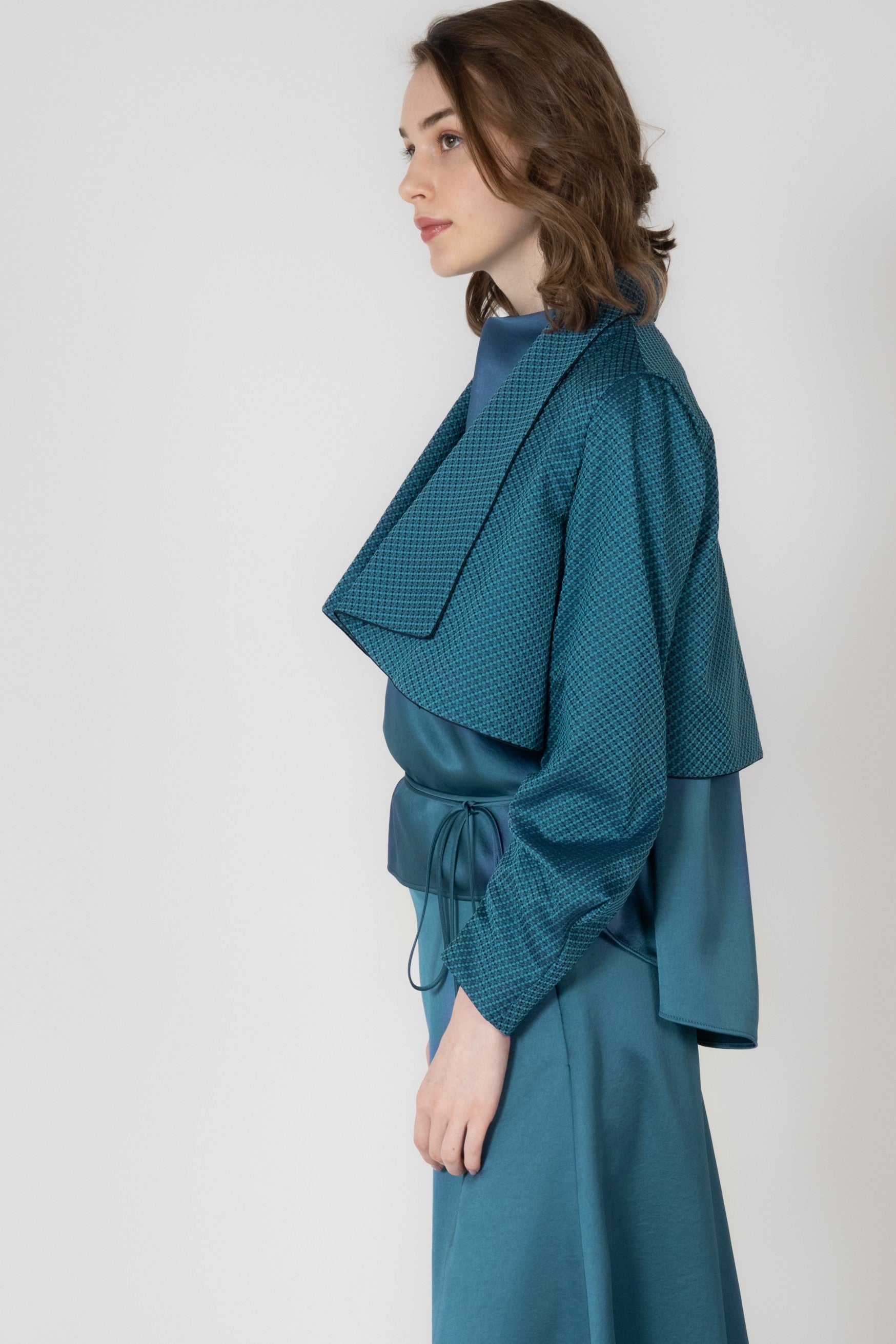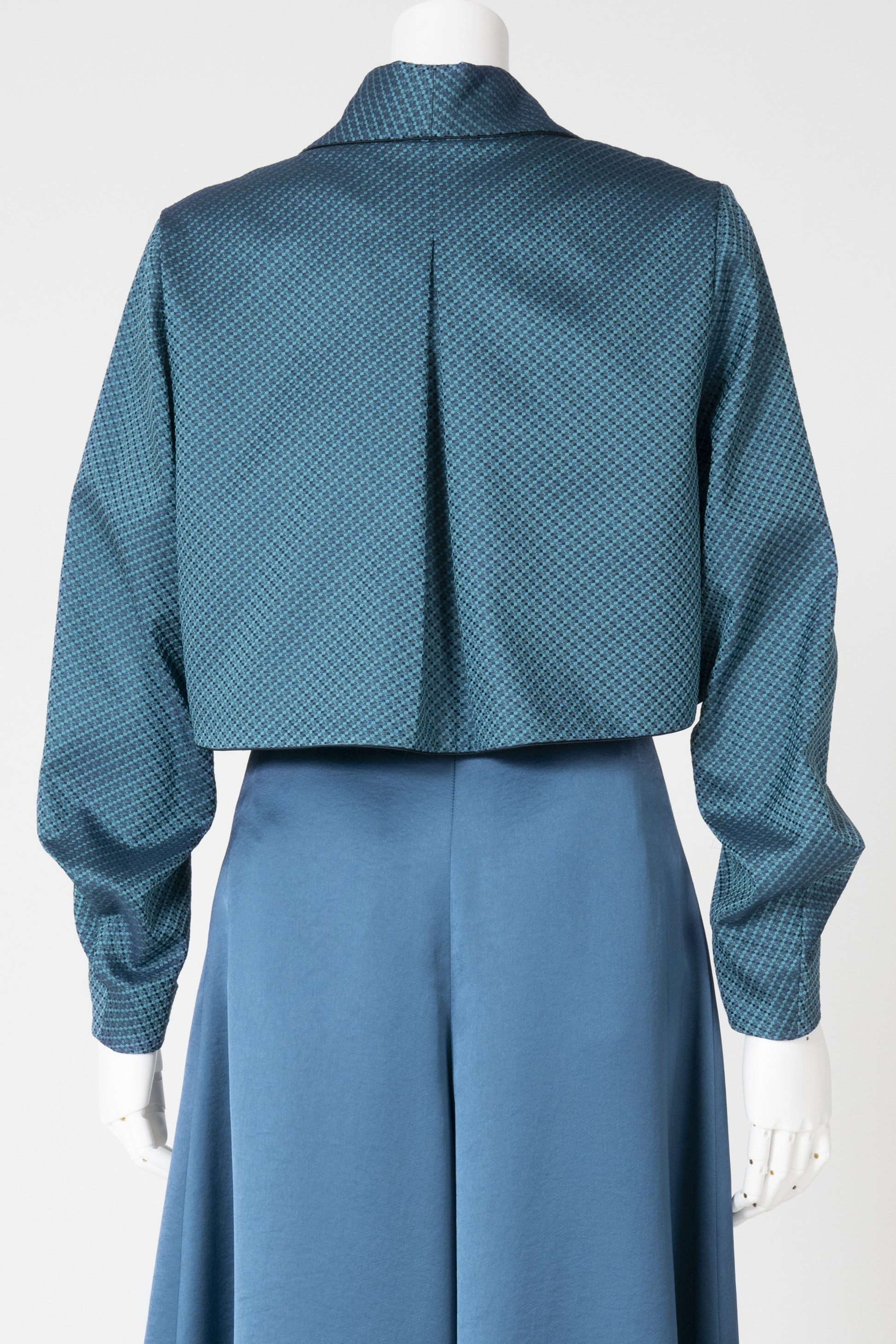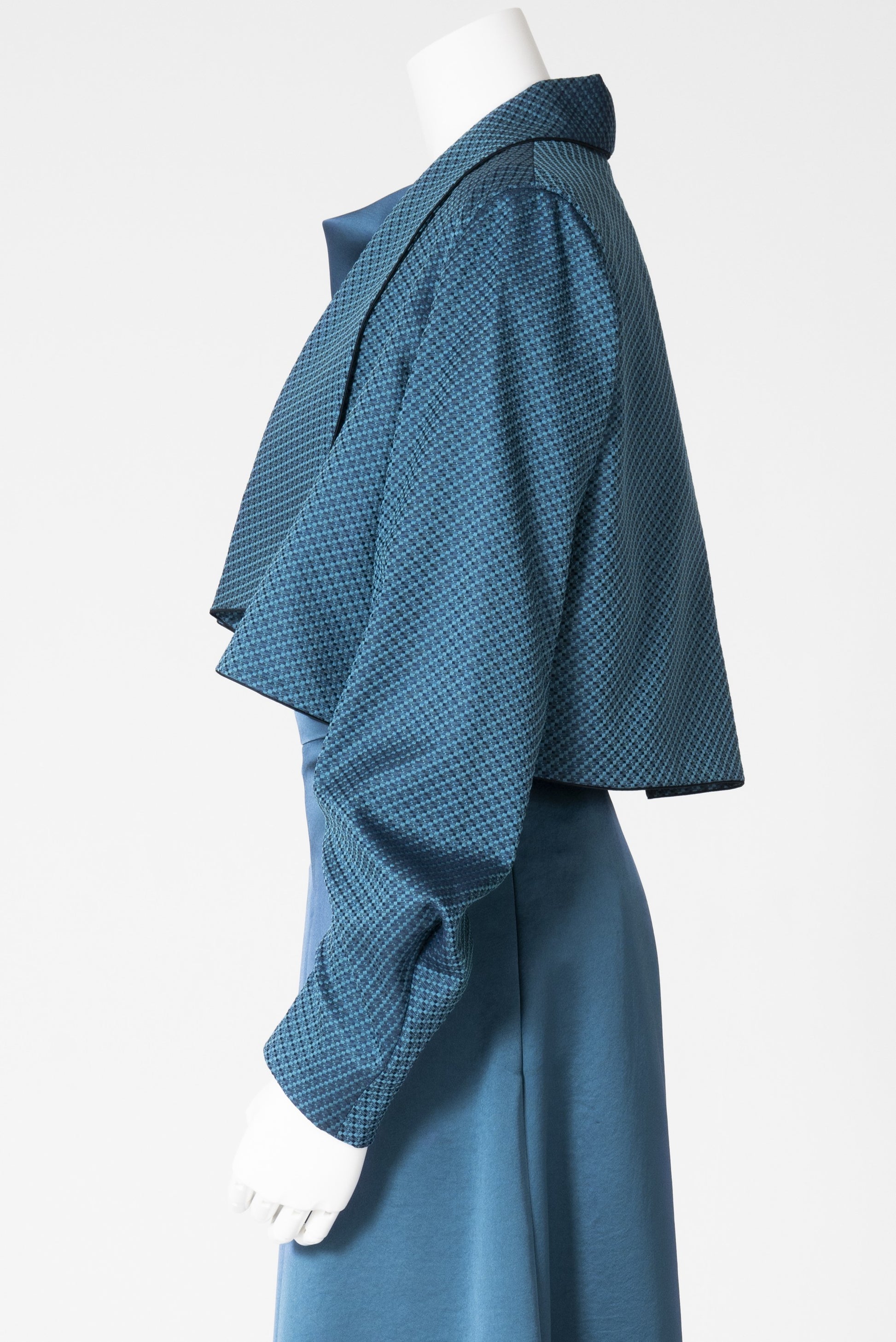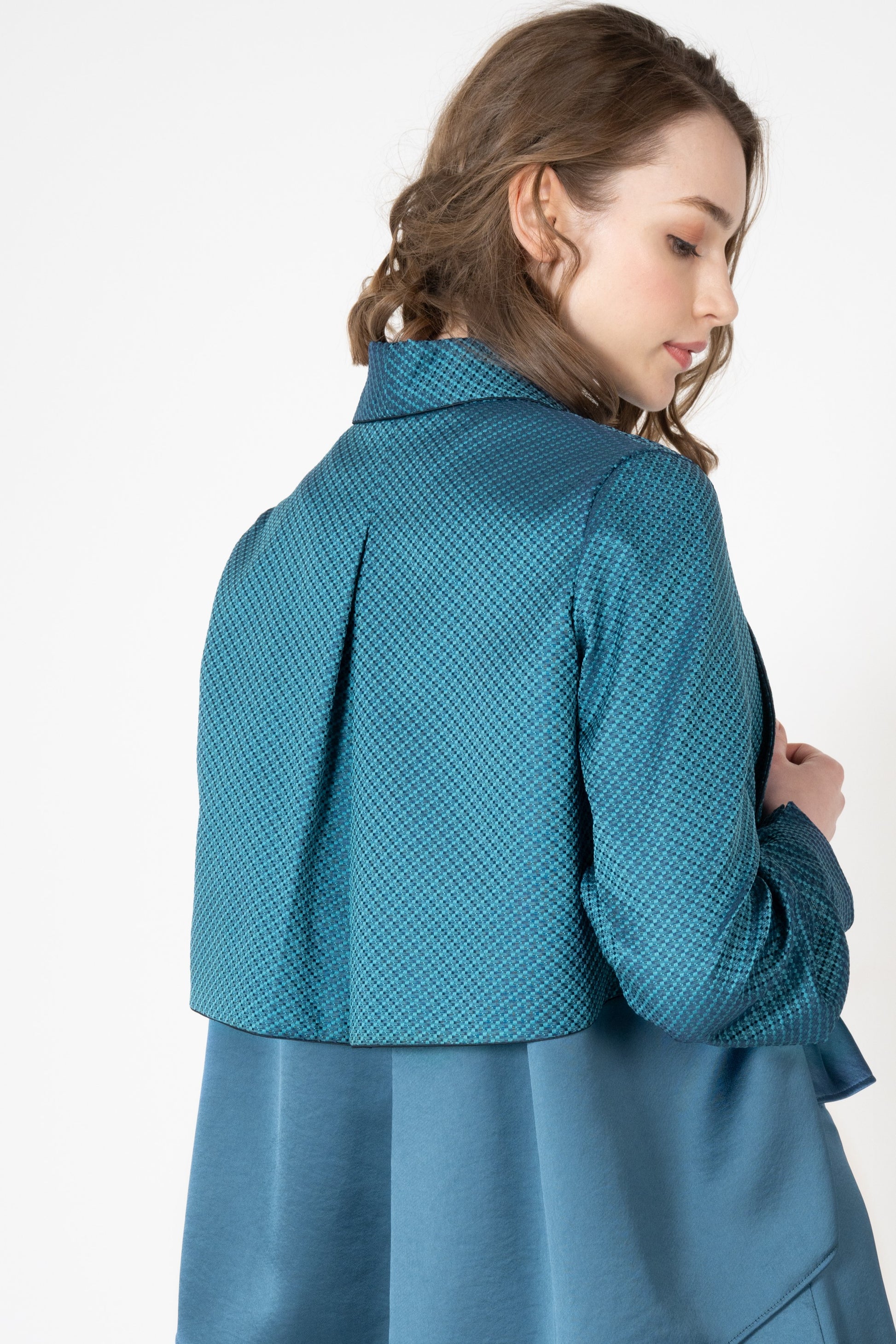 羽織るだけで自然に肩が決まり、軽やかに装えるショート丈。背面のボックスタックが動きやすさと美しい後ろ姿を叶え、深く刻まれたヒダが柔らかな陰影を生み出します