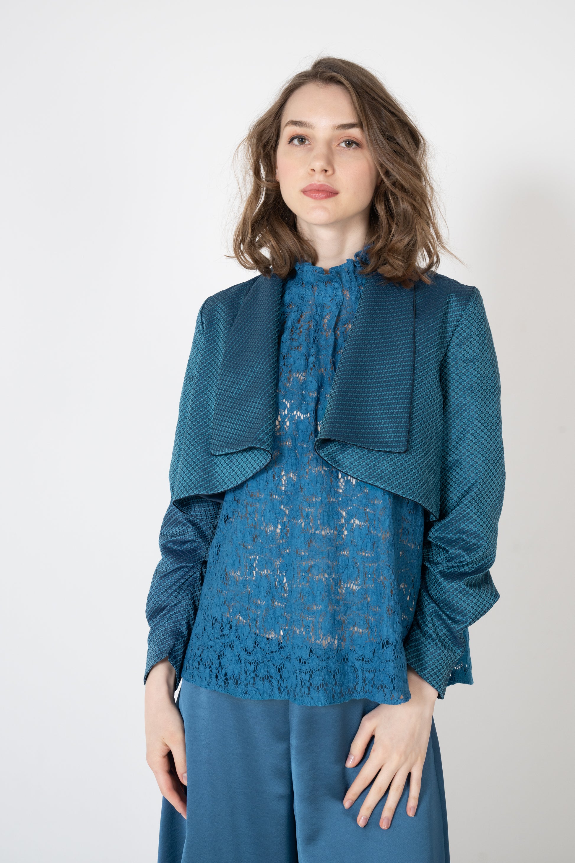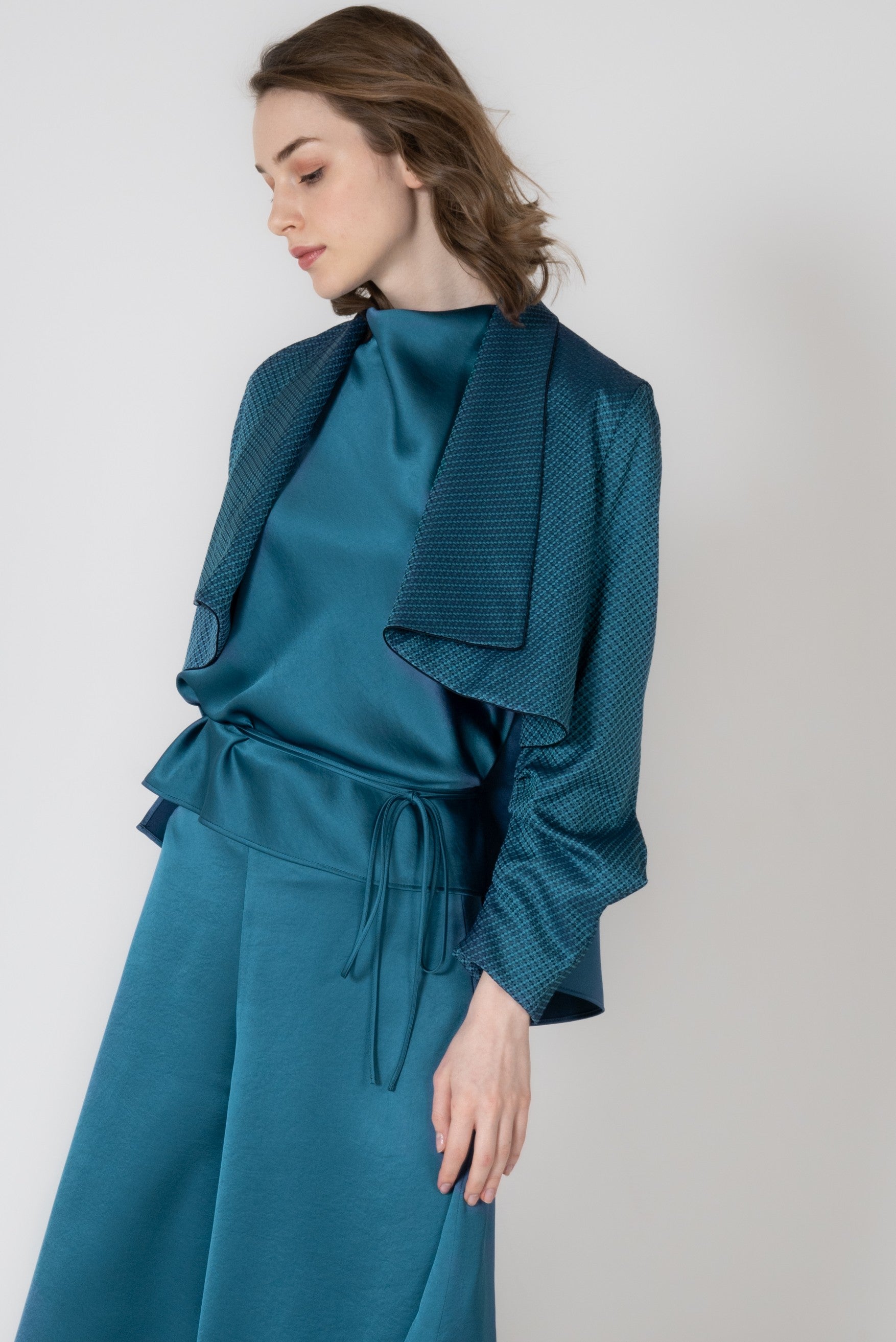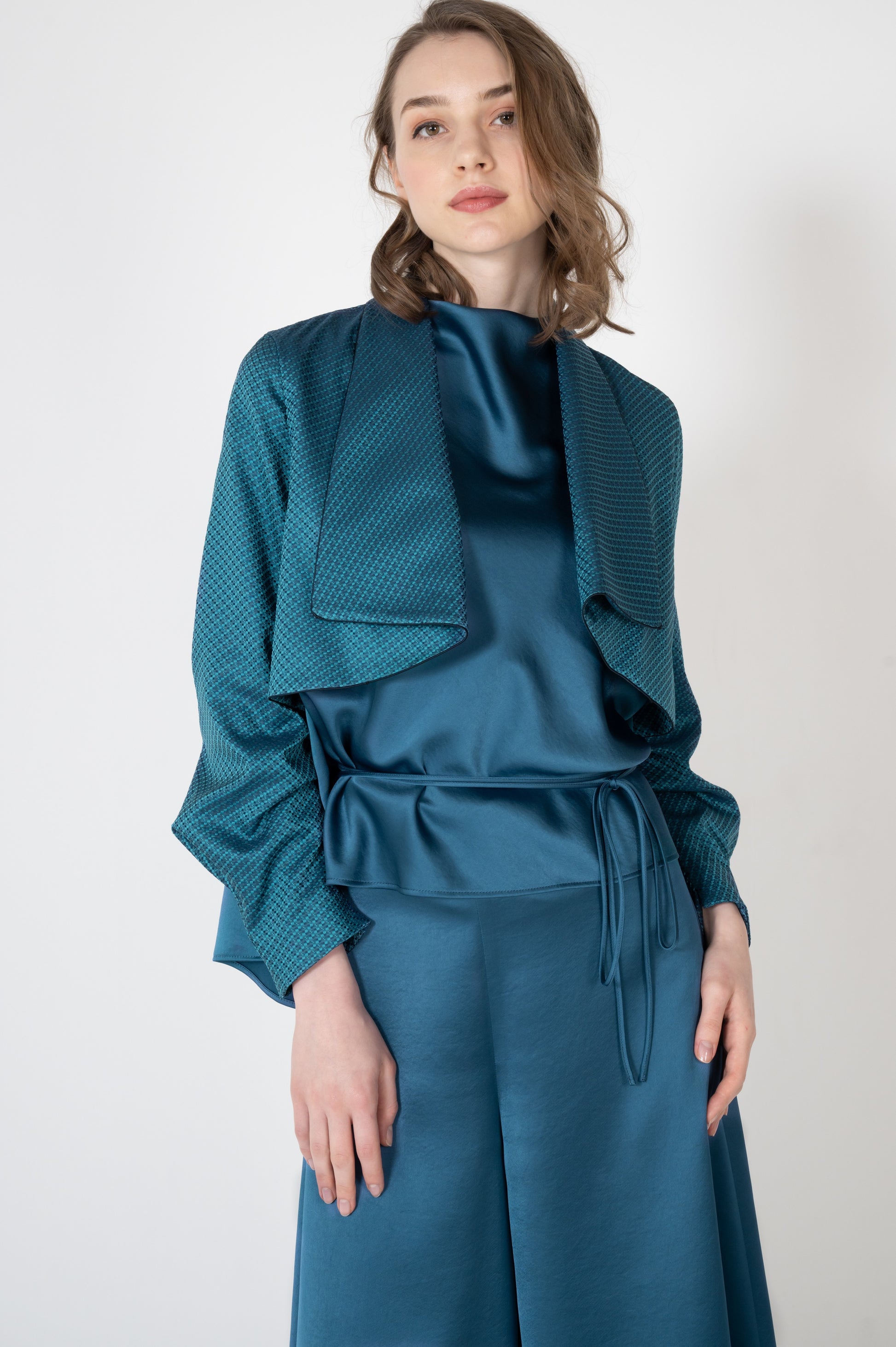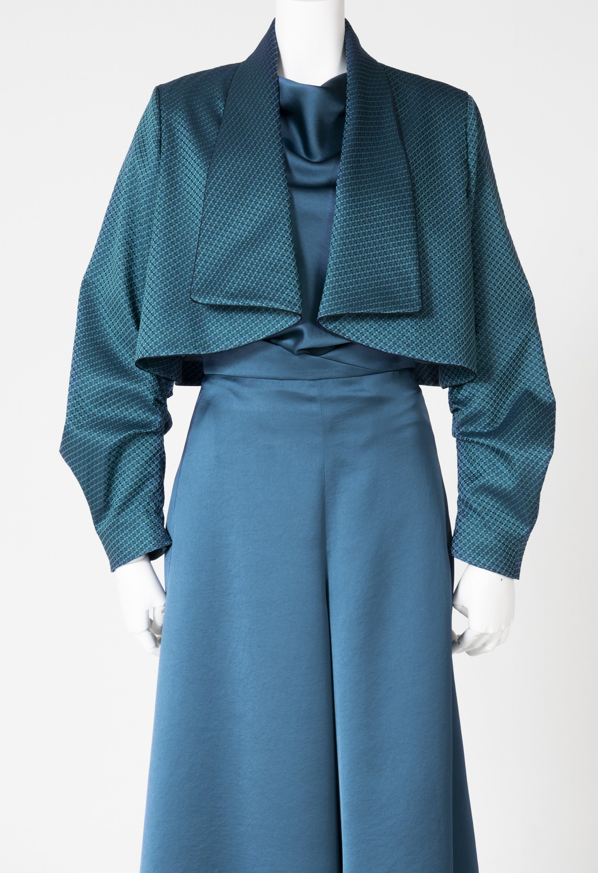 羽織るだけで自然に肩が決まり、軽やかに装えるショート丈。背面のボックスタックが動きやすさと美しい後ろ姿を叶え、深く刻まれたヒダが柔らかな陰影を生み出します